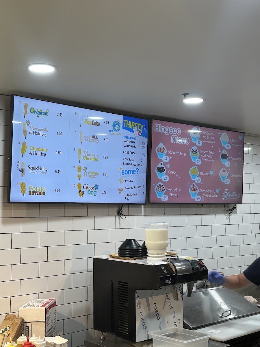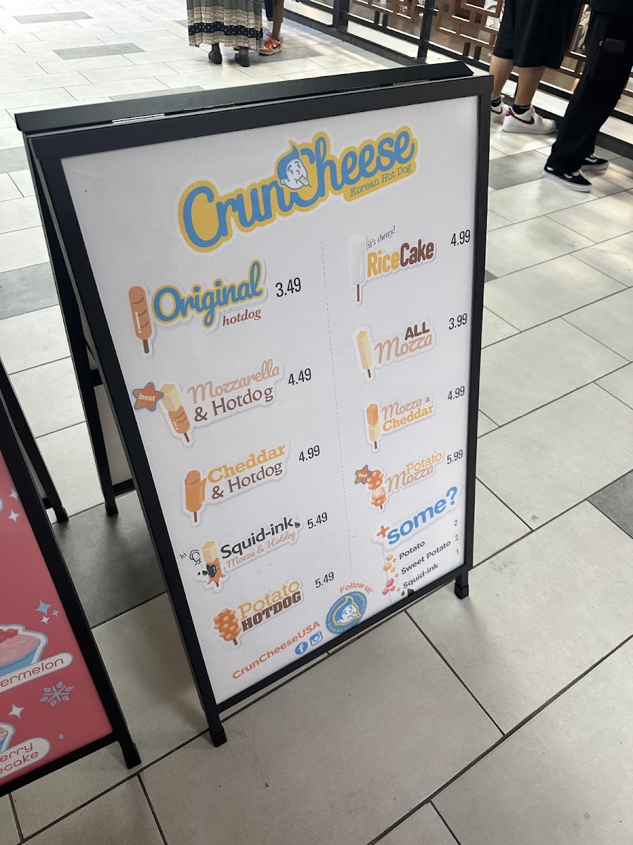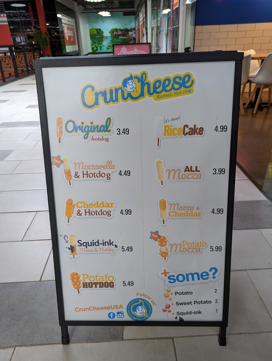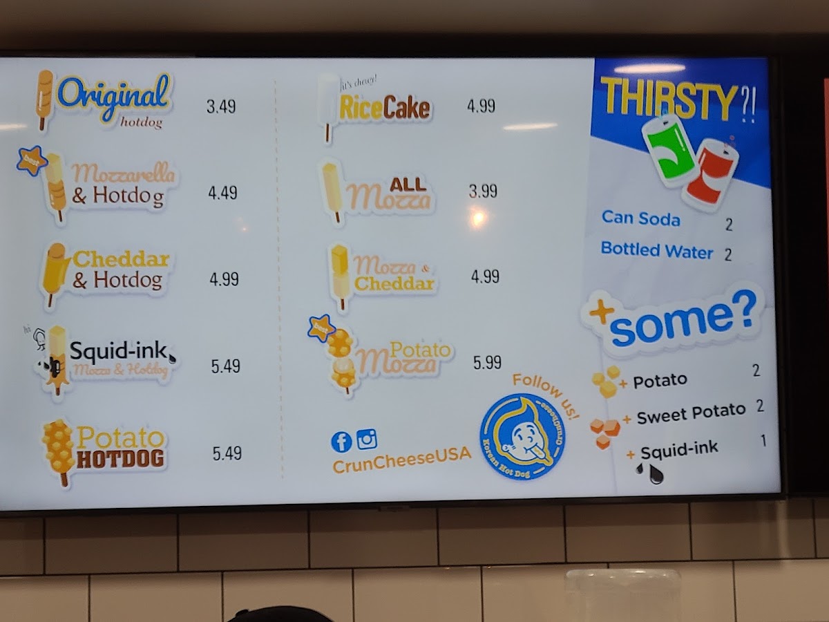 From a reviewer’s perspective, the menu at Cruncheese Korean Hot Dog offers a fun and focused selection that highlights their signature Korean-style hot dogs and refreshing drinks. The food menu features popular items like the Original Hotdog, Mozza Hotdog, Cheddar Hotdog, Squid-Ink Mozzarella Hotdog, and Potato Hotdog, each offering a different texture and flavor combination, especially for cheese lovers and those looking for something unique. On the drinks side, simple and refreshing options such as Soda, Bottled Water, Lemonade, Fruit Punch, and Refresher pair well with the savory hot dogs and help balance the richness of the fried items. Overall, the menu is straightforward but appealing, focusing on a few specialty items done well, making it easy for customers to choose while still offering enough variety to try something new each visit.